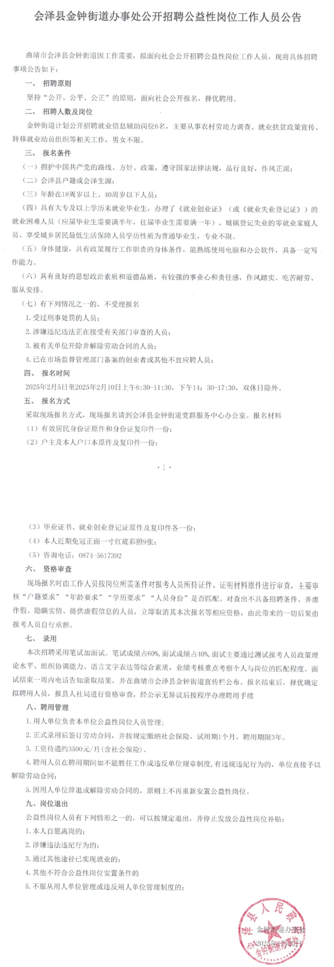 會澤縣金鐘街道辦事處公開招聘公益性崗位工作人員公告