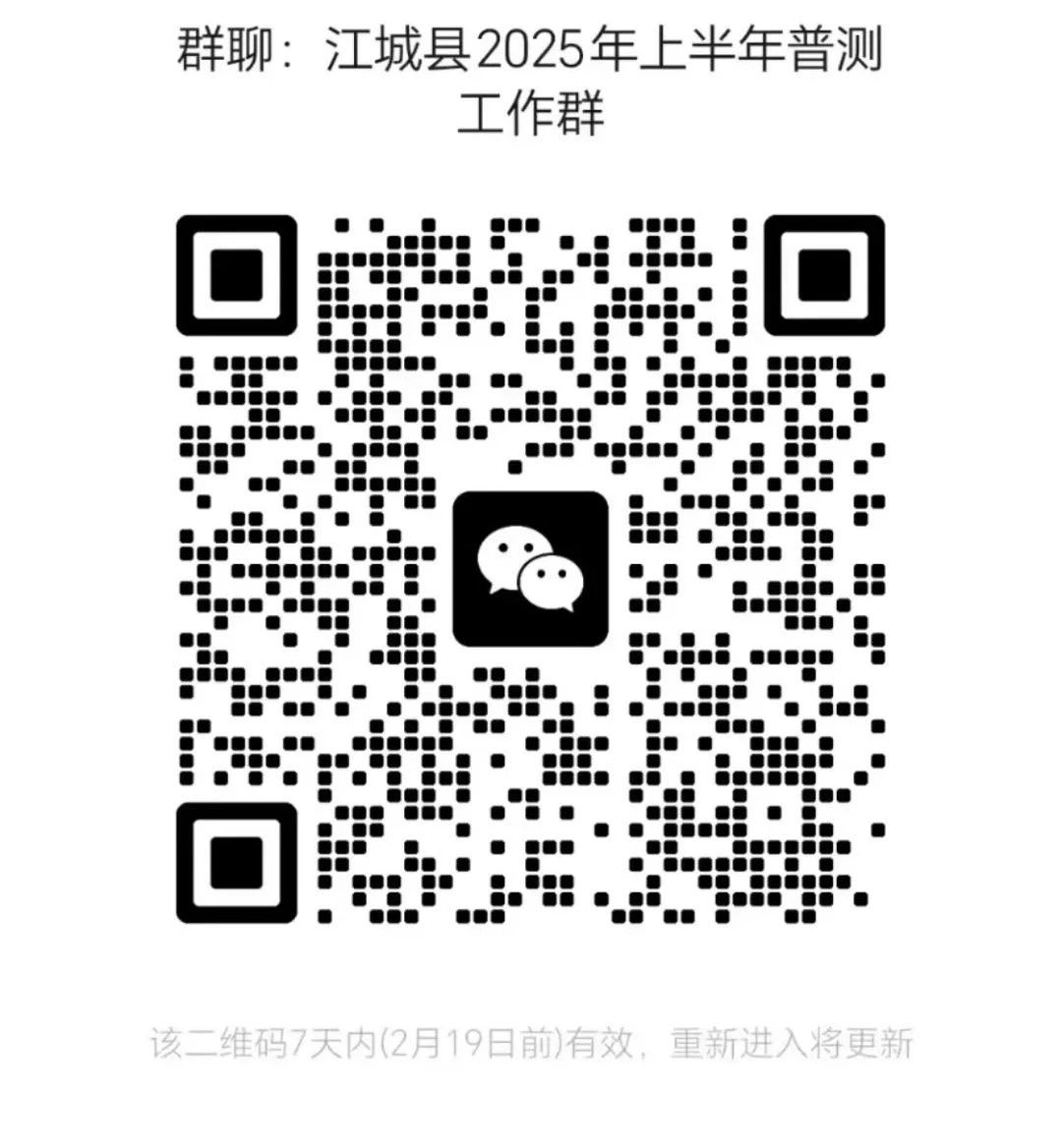 4.線上報(bào)名完成后,請及時(shí)微信掃碼進(jìn)入“江城縣2025年上半年普測群”,實(shí)時(shí)關(guān)注群公告及動態(tài)。