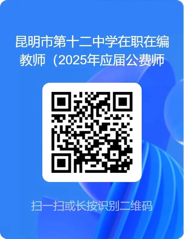2.報名方式:登錄昆十二中教育集團(tuán)微信公眾平臺查看招考公告,掃描二維碼,填寫電子報名表單,簡歷投遞郵箱。