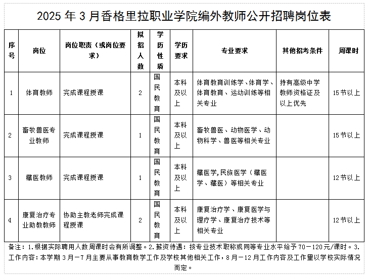 因?qū)W校工作需要,香格里拉職業(yè)學院面向社會公開招聘6名編外教師,現(xiàn)將有關事項公告如下:
