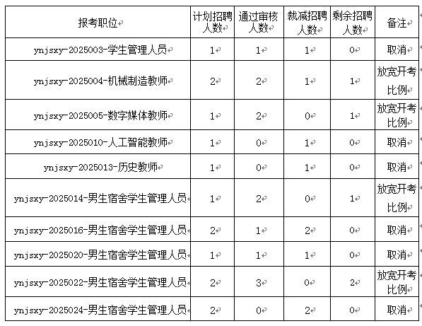 根據(jù)《2025年云南惠民勞務(wù)服務(wù)有限公司勞務(wù)派遣人員公開招聘啟示》,按招聘啟示第五部分:報(bào)名程序(六)招聘計(jì)劃裁減“每個(gè)崗位的報(bào)名成功人數(shù)與計(jì)劃招聘人數(shù)不低于3:1方能開考。未達(dá)到3:1的,根據(jù)報(bào)名成功人數(shù)予以裁減或取消。招聘急需緊缺專業(yè)崗位,經(jīng)云南技師學(xué)院(云南工貿(mào)職業(yè)技術(shù)學(xué)院)研究同意后可放寬開考比例”。經(jīng)云南技師學(xué)院(云南工貿(mào)職業(yè)技術(shù)學(xué)院)研究同意,2025年云南惠民勞務(wù)服務(wù)有限公司勞務(wù)派遣人員公開招聘崗位放寬開考比例和取消情況如下: