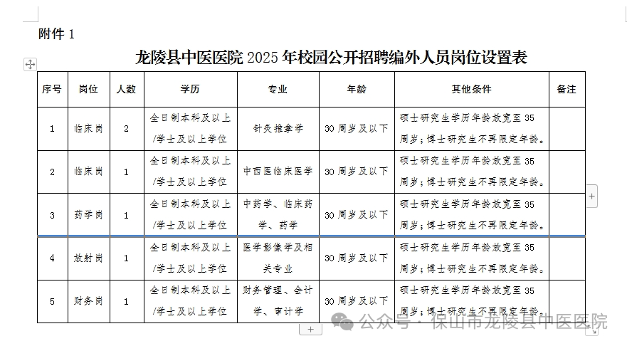 附件:1.龍陵縣中醫(yī)醫(yī)院2025年校園公開招聘編外人員崗位設(shè)置表