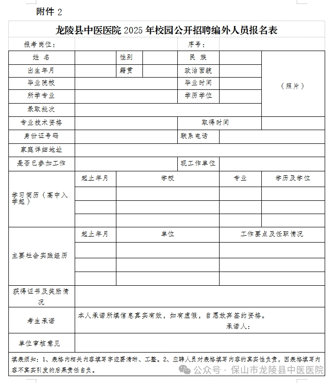 1.《龍陵縣中醫(yī)醫(yī)院2025年校園公開招聘編外人員報名表》(附件2)。