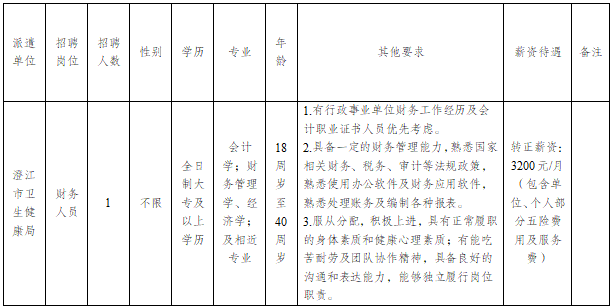 澄江市衛(wèi)生健康局因工作需要,委托澄江市啟澄人力資源有限責(zé)任公司,面向社會(huì)公開招聘財(cái)務(wù)人員1名,現(xiàn)將有關(guān)事項(xiàng)公告如下: