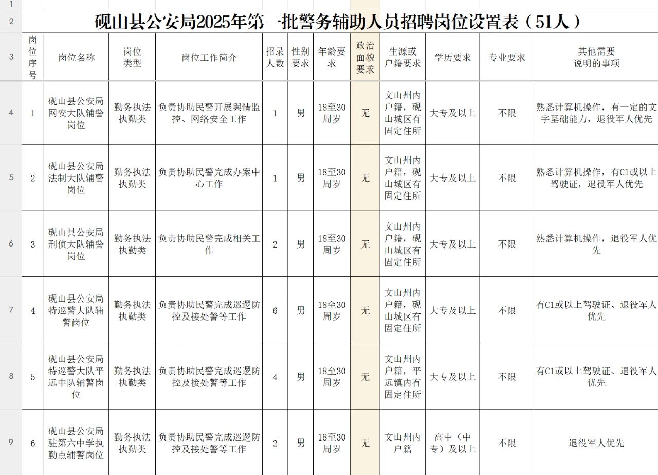 硯山縣公安局此次面向社會公開招聘輔警51名。招聘崗位及人數(shù)詳見《硯山縣公安局2025年第一批警務輔助人員招聘崗位設(shè)置表》。