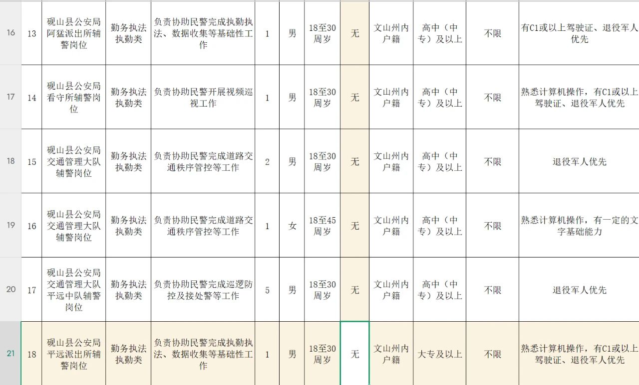 2、年滿18至45周歲(1995年3月14日出生至2007年3月14日出生)的中華人民共和國公民,具有招聘崗位所要求的文化程度及其他要求(詳見《硯山縣公安局2025年第一批警務輔助人員招聘崗位設(shè)置表》)。