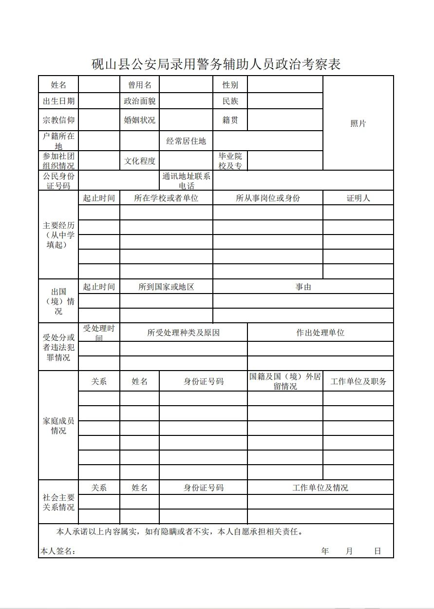 (4) 真實完整填寫好的《硯山縣公安局輔警招聘報名表》、《硯山縣公安局輔警招聘誠信承諾書》、《硯山縣公安局錄用警務輔助人員政治考察表》;