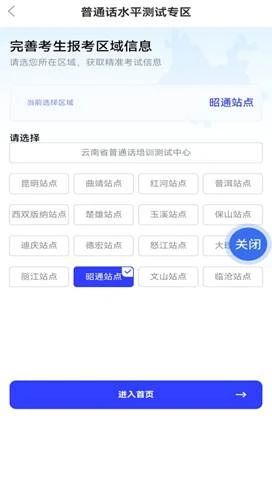 完成實(shí)名認(rèn)證后,在APP首頁找到“普通話測(cè)試報(bào)名”,點(diǎn)擊進(jìn)入普通話水平測(cè)試專區(qū)界面,選擇“云南省普通話培訓(xùn)測(cè)試中心”后,點(diǎn)擊“進(jìn)入首頁”。