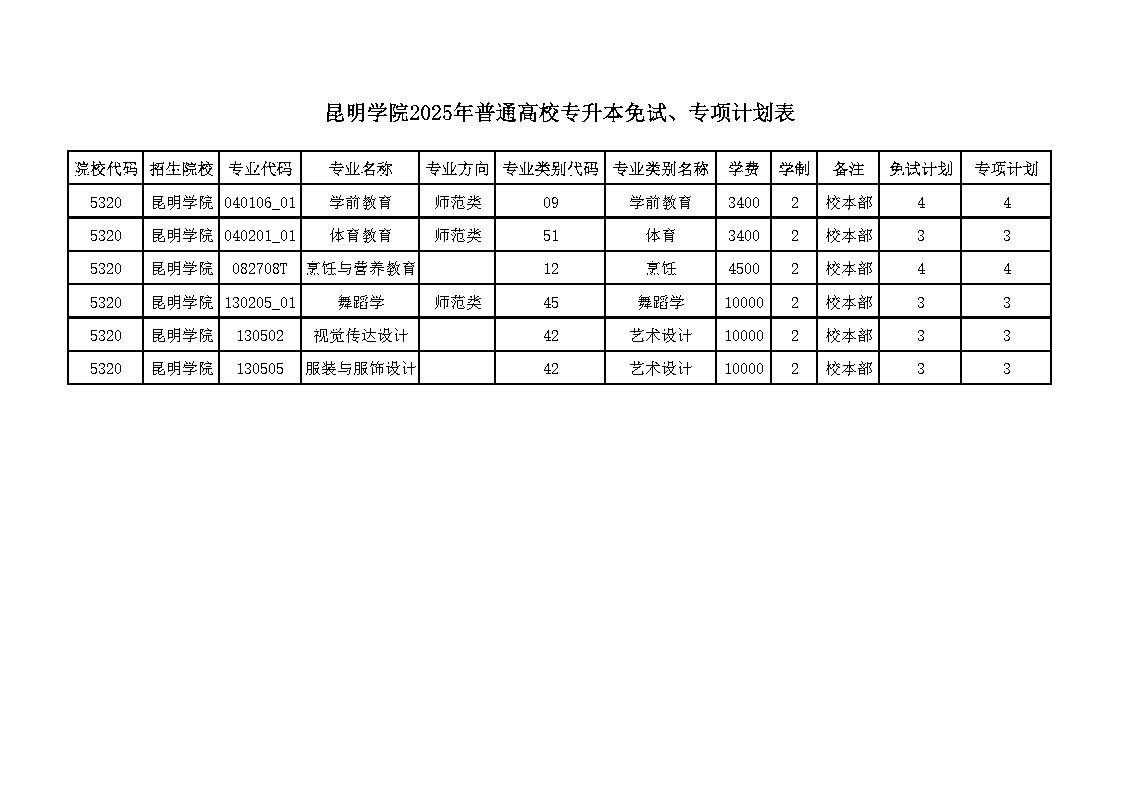 2025年昆明學(xué)院普通高校專升本免試、專項(xiàng)計劃表