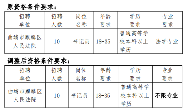 根據(jù)《曲靖市麒麟?yún)^(qū)人民法院2025年公開招聘聘用制書記員公告》的報(bào)名資格審查情況,經(jīng)研究,決定放寬崗位的招聘條件,具體如下:
