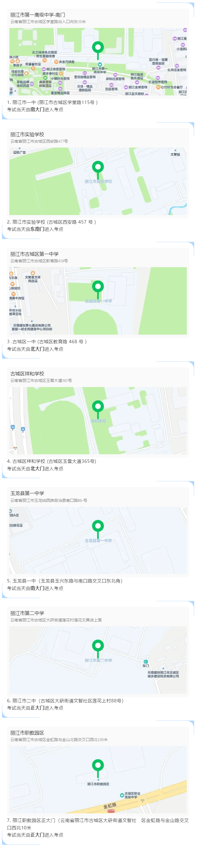 麗江市2025年事業(yè)單位公開招聘工作人員公共科目筆試將于3月29日舉行,我市共設(shè)有7個考點,分別是:麗江市第一高級中學、麗江市實驗學校、古城區(qū)一中、古城區(qū)祥和學校、玉龍縣一中、麗江職教園區(qū)、麗江市第二中學。為了確保各位考生順利考試,特作以下提示: