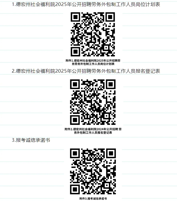 符合條件并有意向的應(yīng)聘者請(qǐng)自行下載填寫(xiě)《德宏州社會(huì)福利院2025年公開(kāi)招聘勞務(wù)外包制工作人員報(bào)名登記表》《報(bào)考誠(chéng)信承諾書(shū)》,并按要求提供畢業(yè)證、學(xué)位證、有效身份證、相關(guān)資格證及其他證明材料的原件、復(fù)印件各1份,本人近期小一寸免冠照片1張。