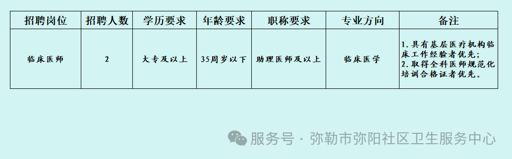 為加強(qiáng)基層醫(yī)療衛(wèi)生人才隊(duì)伍建設(shè),提升社區(qū)衛(wèi)生服務(wù)能力,經(jīng)研究決定,彌勒市彌陽社區(qū)衛(wèi)生服務(wù)中心現(xiàn)面向社會公開招聘合同制臨床醫(yī)師2名。具體事項(xiàng)公告如下: