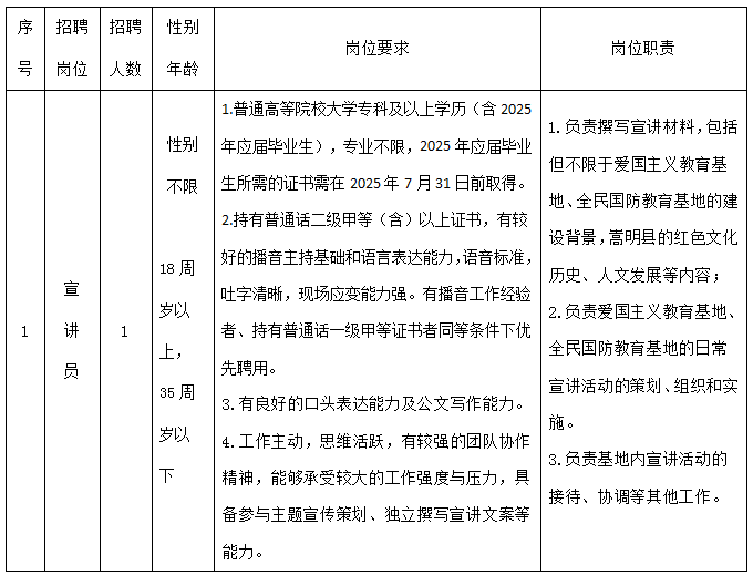宣講員1名,詳見(jiàn)云南琞源商業(yè)運(yùn)營(yíng)管理有限公司公開招聘派遣制宣講員招聘計(jì)劃表(附件1)。