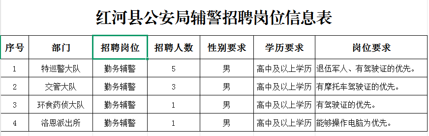 (紅河縣公安局公開招聘輔警崗位信息表)