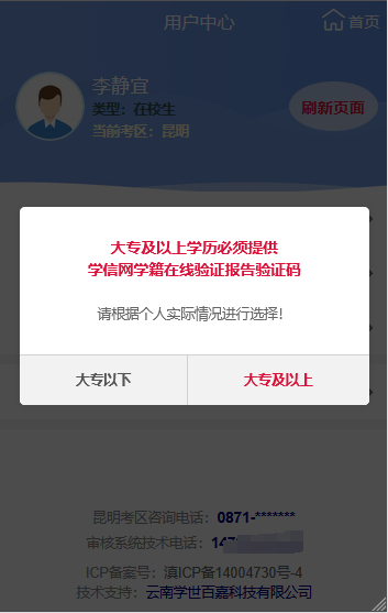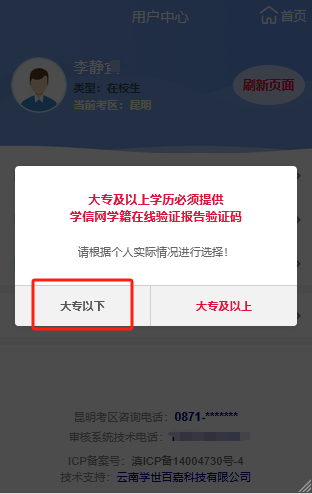 如果注冊(cè)的時(shí)候選擇了“在校生”系統(tǒng)提示考生選擇“大專以下”或者“大專及以上”