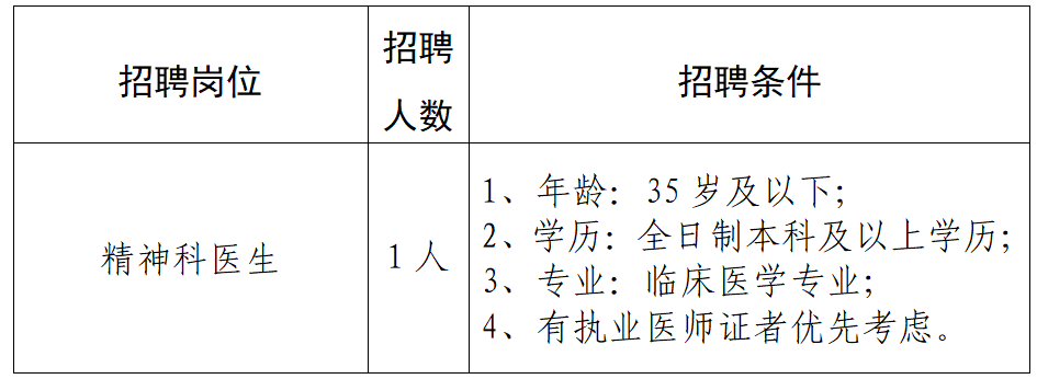 根據(jù)醫(yī)院業(yè)務發(fā)展需求,現(xiàn)需招聘精神科醫(yī)生1人,具體招聘條件如下: