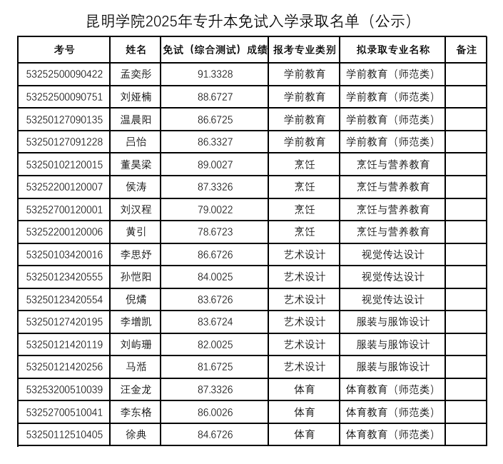 昆明學(xué)院2025年專升本免試入學(xué)錄取名單(公示)