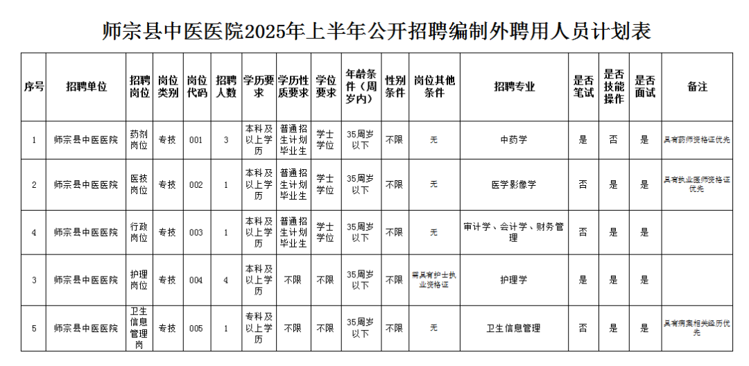 附件:1、師宗縣中醫(yī)醫(yī)院2025年上半年公開(kāi)招聘編制外聘用人員計(jì)劃表