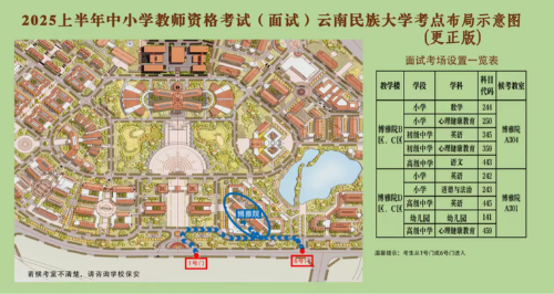 現(xiàn)對(duì)《2025年上半年中小學(xué)教師資格考試(面試)昆明考區(qū)考務(wù)事項(xiàng)公告》附件中云南民族大學(xué)考點(diǎn)布局示意圖信息更正如下: