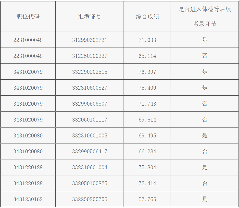 在面試合格分數(shù)線以上人員中,按照綜合成績排名和職位招錄人數(shù),等額確定進入體檢和考察的人選。