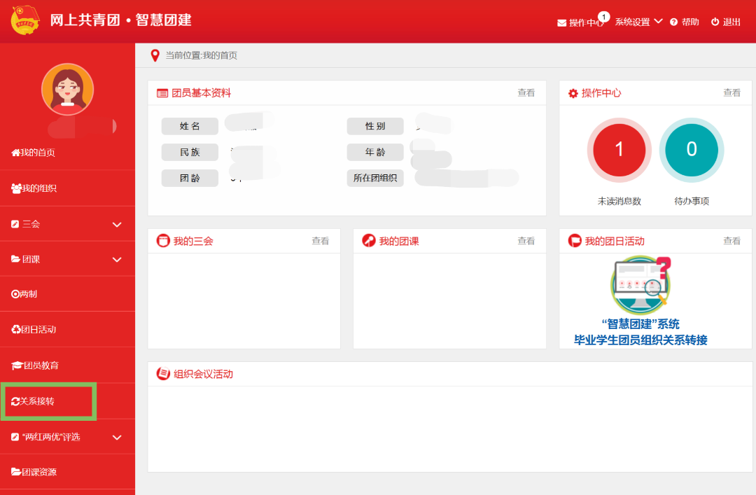 進(jìn)入“個(gè)人中心”后點(diǎn)擊左下角“關(guān)系轉(zhuǎn)接”團(tuán)員個(gè)人發(fā)起的情況,可以由團(tuán)員登錄系統(tǒng)進(jìn)入個(gè)人中心,點(diǎn)擊左側(cè)“關(guān)系轉(zhuǎn)接”。在“關(guān)系轉(zhuǎn)接”填好個(gè)人信息、轉(zhuǎn)入組織是否屬于北京、廣東、福建、轉(zhuǎn)接原因、申請(qǐng)轉(zhuǎn)入組織信息。