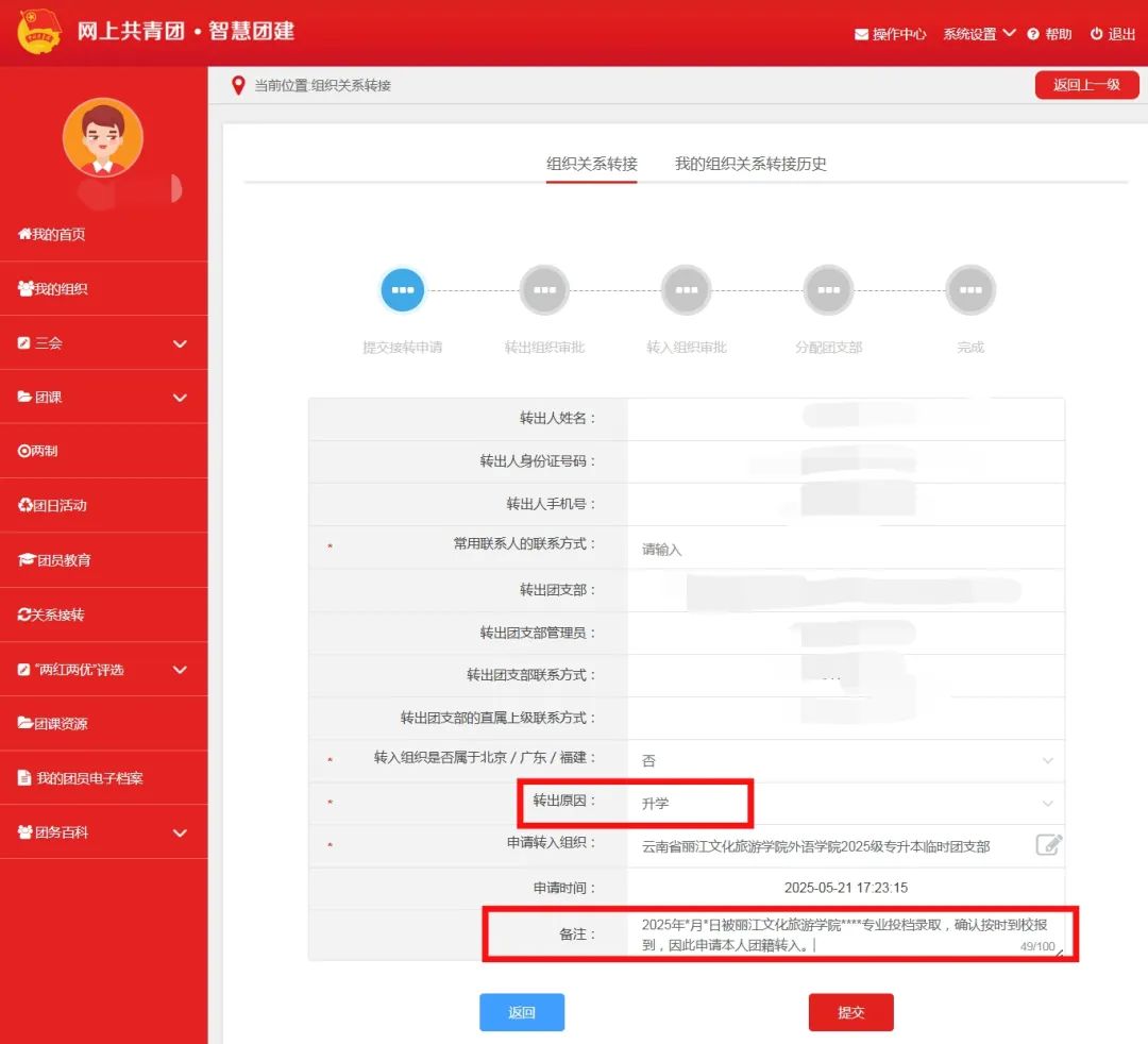 備注寫(xiě)明:2025年*月*日被麗江文化旅游學(xué)院**學(xué)院***專(zhuān)業(yè)投檔錄取,確認(rèn)按時(shí)到校報(bào)到,因此申請(qǐng)本人團(tuán)籍轉(zhuǎn)入。