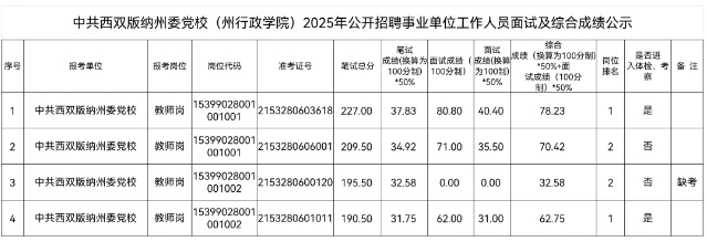 根據(jù)《云南省事業(yè)單位公開招聘工作人員辦法》(云人社發(fā)〔2016〕182號)、《西雙版納州2025年公開招聘事業(yè)單位工作人員公告》和《中共西雙版納州委黨校(州行政學(xué)院)2025年公開招聘事業(yè)單位工作人員專業(yè)測評崗位面試通告》等有關(guān)規(guī)定,現(xiàn)將中共西雙版納州委黨校(州行政學(xué)院)2025年公開招聘事業(yè)單位工作人員專業(yè)測評崗位面試成績、綜合成績及崗位排名公示如下。
