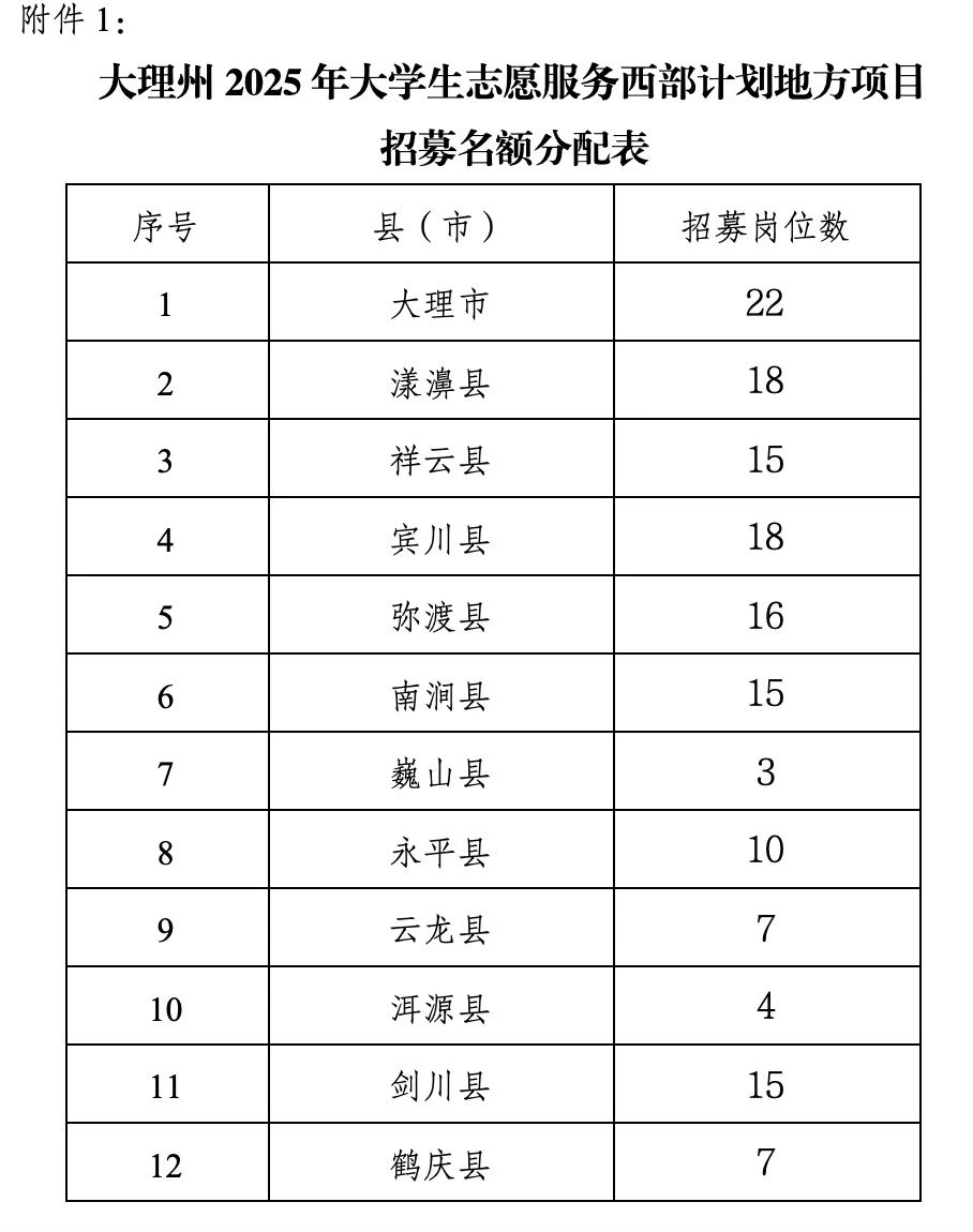 附件1:大理州2025年大學(xué)生志愿服務(wù)西部計(jì)劃地方項(xiàng)目招募名額分配表