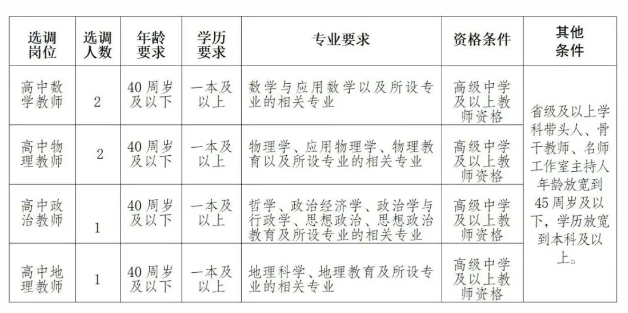 (4)具有一本及以上學(xué)歷,其中省級及以上學(xué)科帶頭人、骨干教師、名師工作室主持人放寬到本科及以上;具有選調(diào)崗位所需的專業(yè)或任職資格、職業(yè)(執(zhí)業(yè))及技能要求,近三年年度履職考核結(jié)果均為合格及其以上,身體健康。