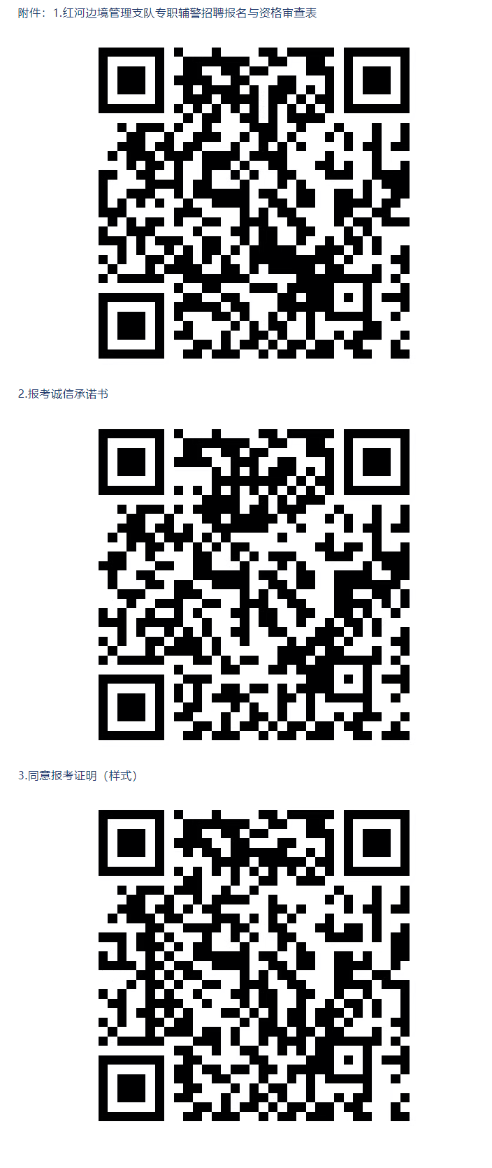 (2)報名時需提交《紅河邊境管理支隊專職輔警招聘報名與資格審查表》(見附件1,粘貼近期免冠半寸彩色照片)一式一份,攜帶本人身份證、戶口本、畢業(yè)證、征信報告、報考誠信承諾書(見附件2)、單位同意報考證明(見附件3,無工作單位的不提供)以及優(yōu)先招聘條件所需的其他證明材料原件及復(fù)印件1份。