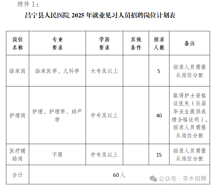 招聘就業(yè)見(jiàn)習(xí)崗60人,其中包括:臨床崗5人、護(hù)理崗40人、醫(yī)療輔助崗15人。招聘的具體崗位、資格條件等詳見(jiàn)《昌寧縣人民醫(yī)院2025年就業(yè)見(jiàn)習(xí)人員招聘崗位計(jì)劃表》(附件1)