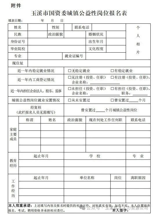 附件:玉溪市人民政府國有資產(chǎn)監(jiān)督管理委員會城鎮(zhèn)公益性崗位報名表