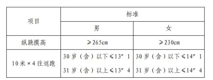 3.縱跳摸高、10米×4往返跑科目實(shí)行一票否決制,達(dá)到規(guī)定項(xiàng)目標(biāo)準(zhǔn)即為合格,未達(dá)標(biāo)準(zhǔn)則為不合格;不合格人員不得參與后續(xù)環(huán)節(jié)的考核,具體測(cè)試標(biāo)準(zhǔn)如下: