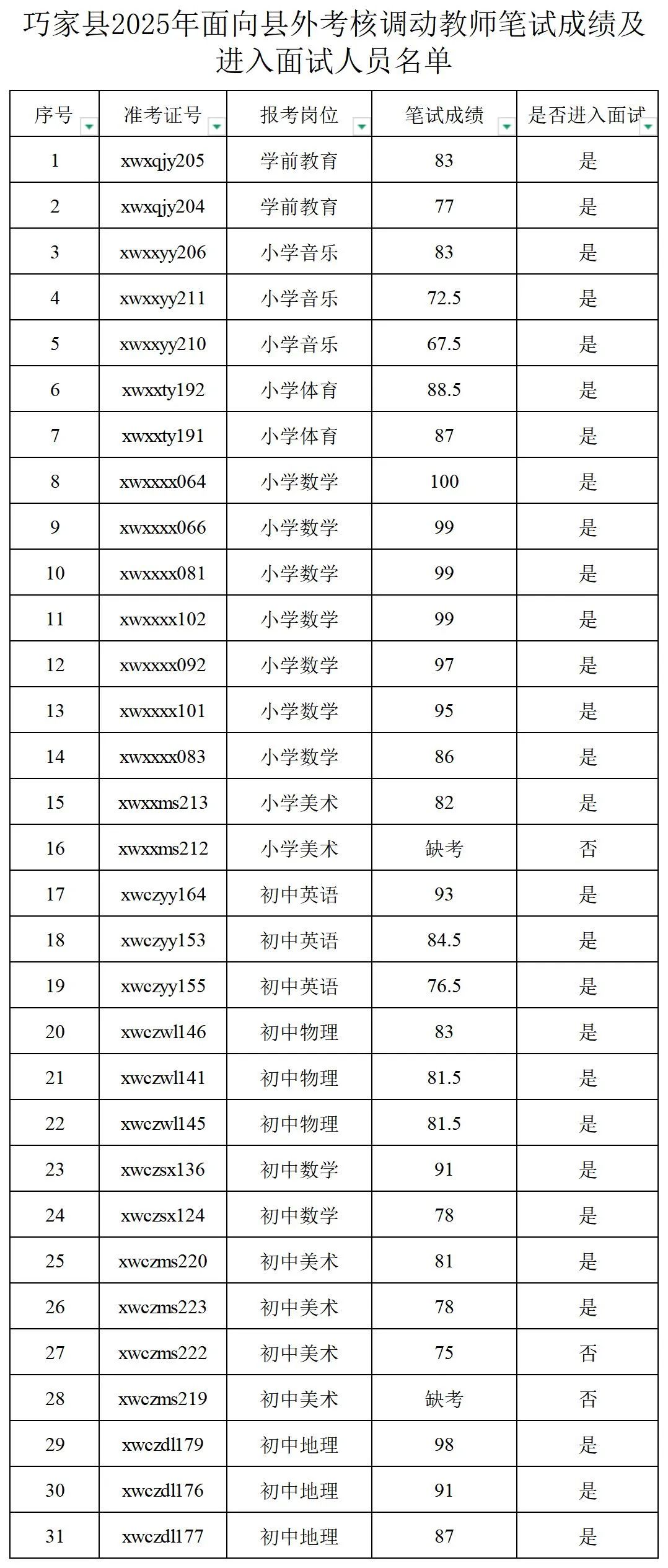 2.巧家縣2025年面向縣外考核調(diào)動(dòng)教師筆試成績(jī)及進(jìn)入面試人員名單