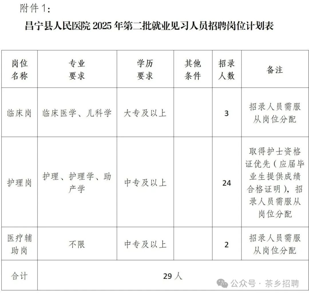 招聘就業(yè)見習崗29人,其中包括:臨床崗3人、護理崗24人、醫(yī)療輔助崗2人。招聘的具體崗位、資格條件等詳見《昌寧縣人民醫(yī)院2025年第二批就業(yè)見習人員招聘崗位計劃表》(附件1)