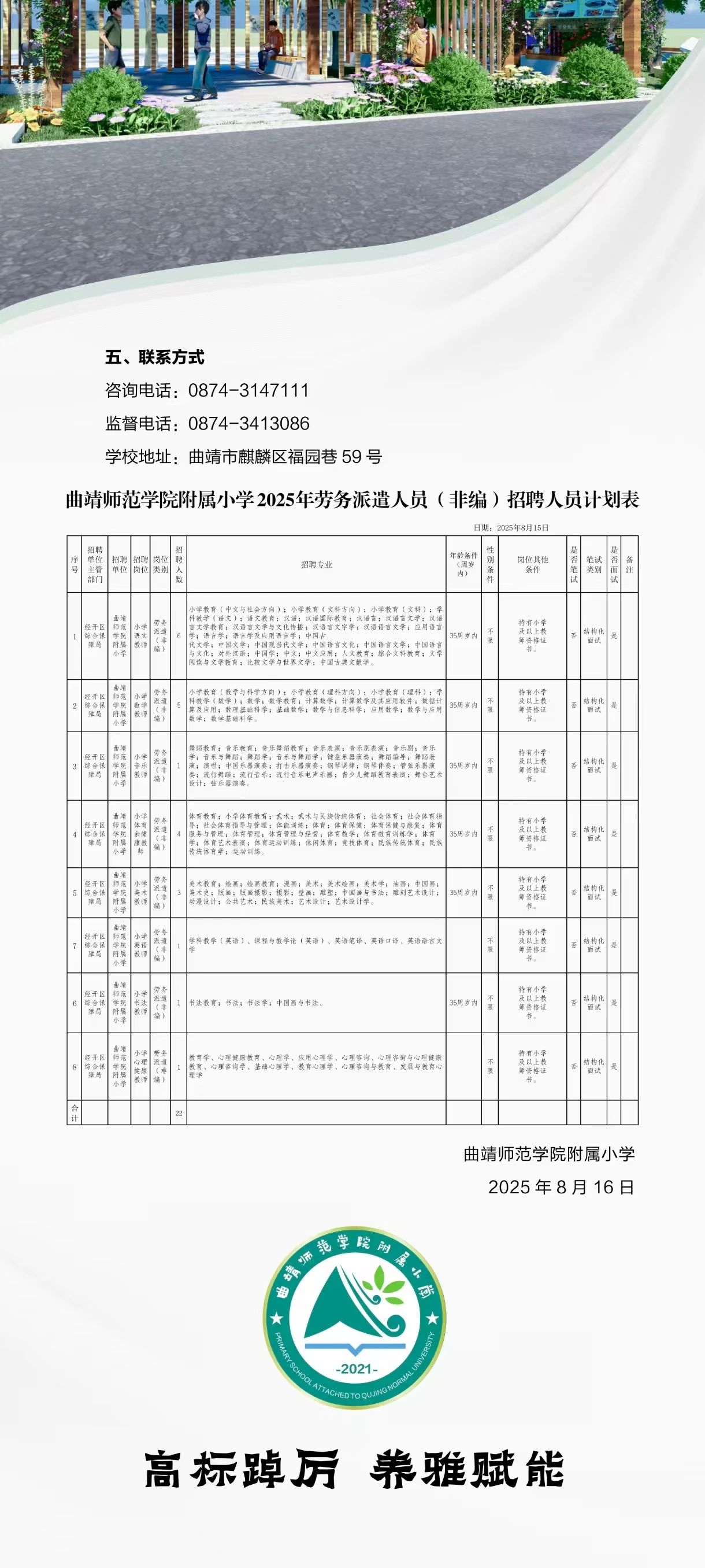 曲靖師范學院附屬小學2025年勞務派遣人員(非編)招聘公告