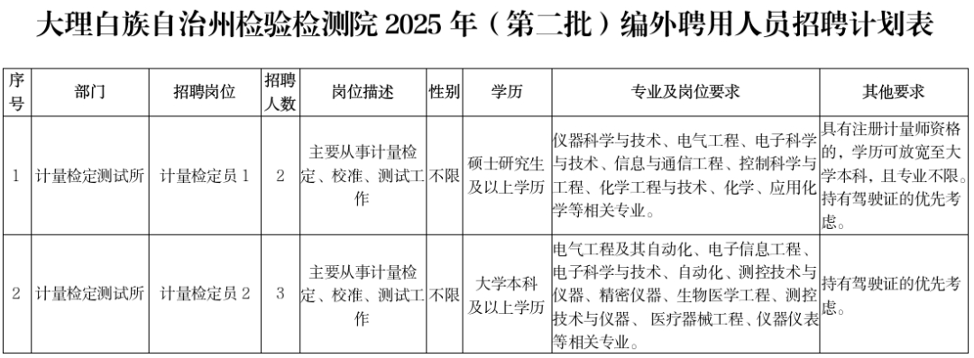 招聘崗位及招聘條件詳見《大理白族自治州檢驗(yàn)檢測(cè)院2025年(第二批)編外聘用人員招聘計(jì)劃表》(詳見附件1)。