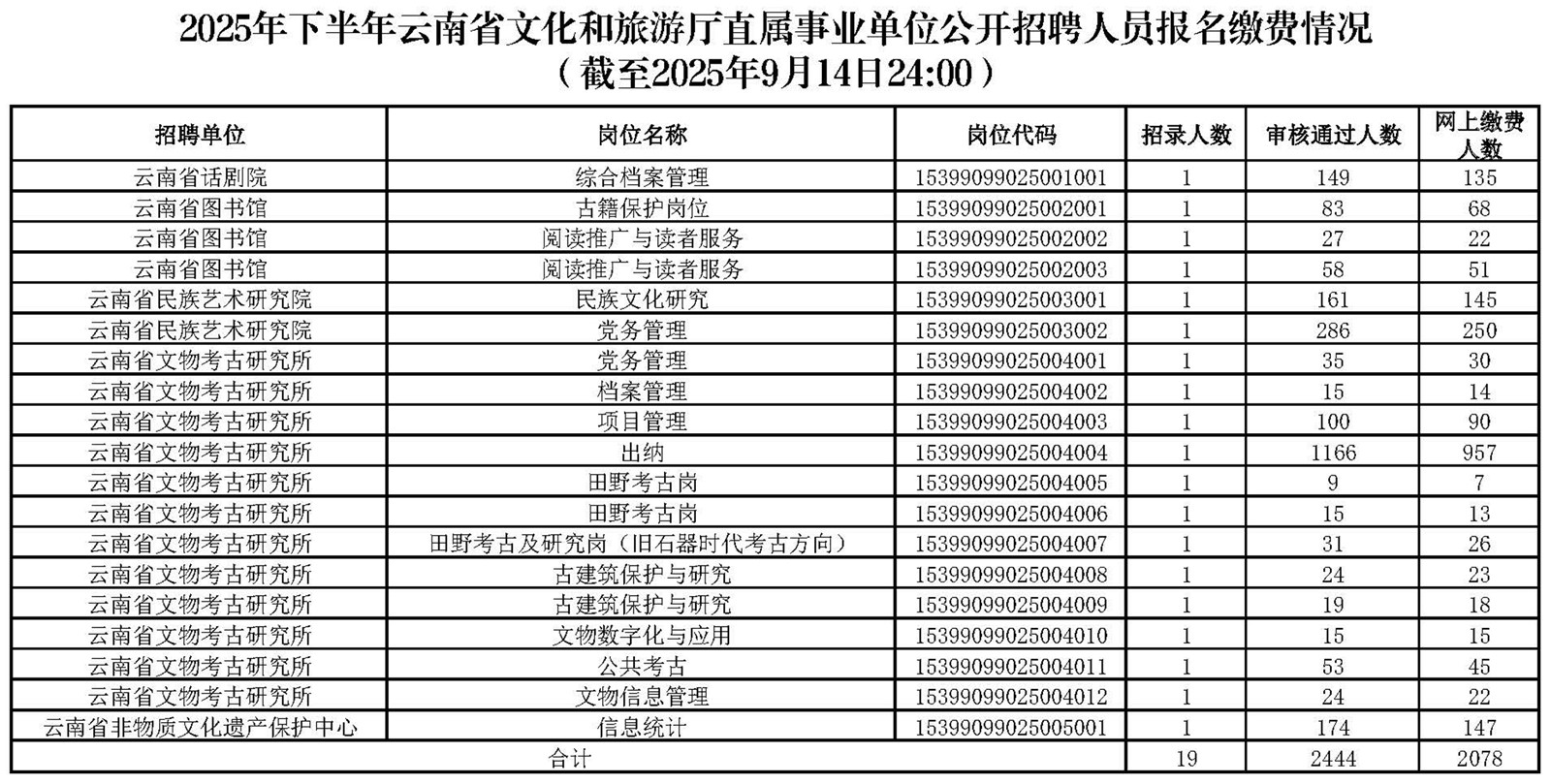2025年下半年云南省文化和旅游廳直屬事業(yè)單位公開招聘人員報名繳費情況 (截至2025年9月14日24:00)