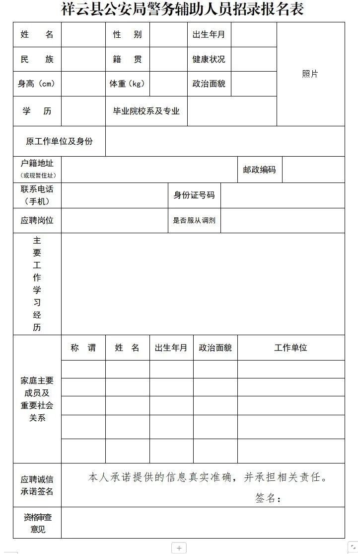 3.報(bào)名方式:本次招聘采取本人現(xiàn)場(chǎng)報(bào)名形式開展,不接受他人代報(bào),應(yīng)聘人員報(bào)名前應(yīng)仔細(xì)閱讀招聘公告,真實(shí)填報(bào)《祥云縣公安局警務(wù)輔助人員招錄報(bào)名表》(自行下載報(bào)名表)。