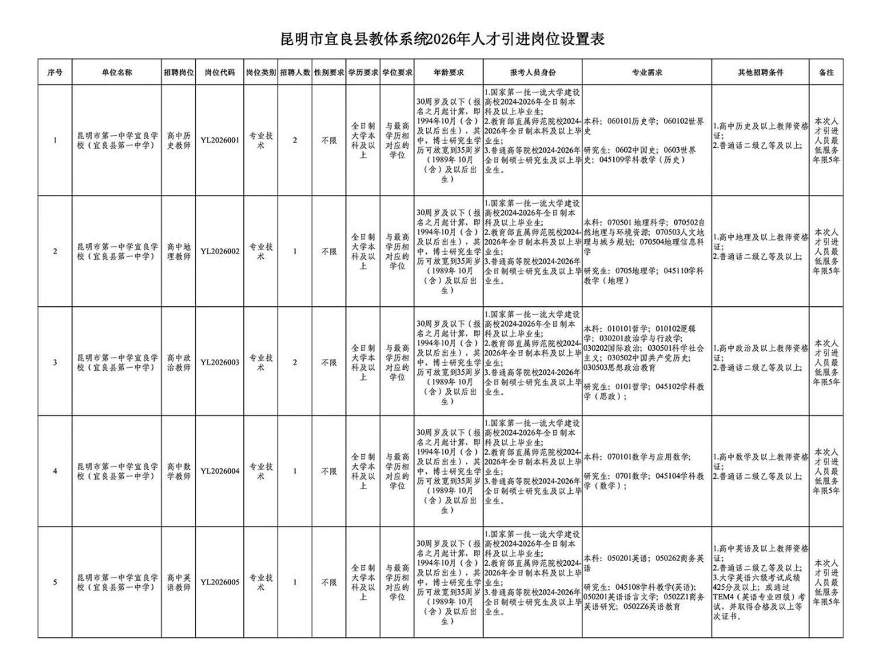 昆明市第一中學(xué)宜良學(xué)校2026年人才引進(jìn)崗位設(shè)置表