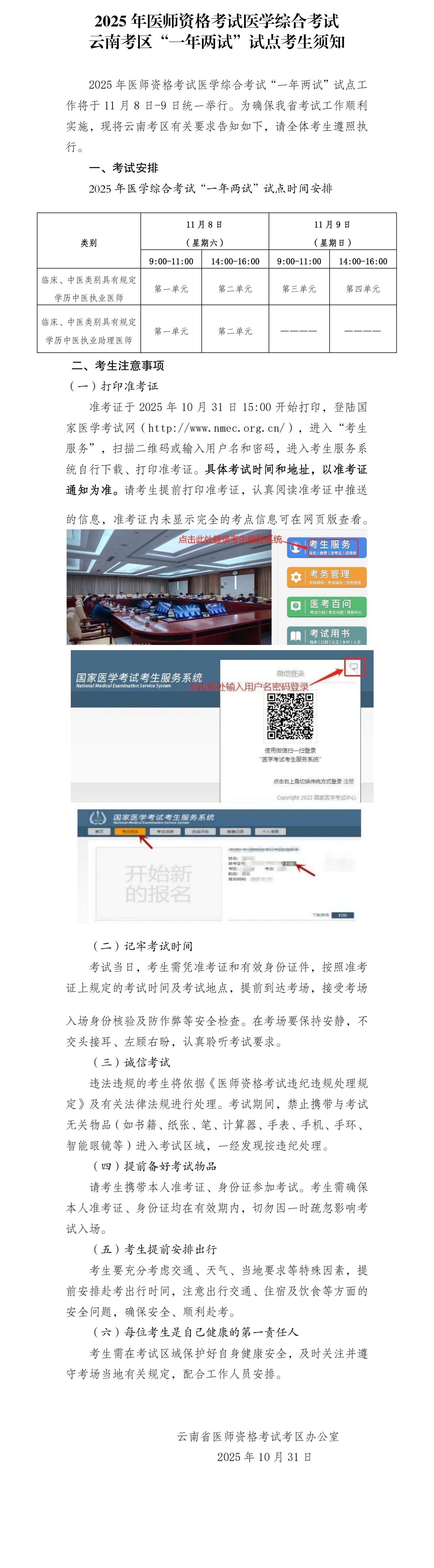 2025年醫(yī)師資格考試醫(yī)學(xué)綜合考試 云南考區(qū)“一年兩試”試點(diǎn)考生須知