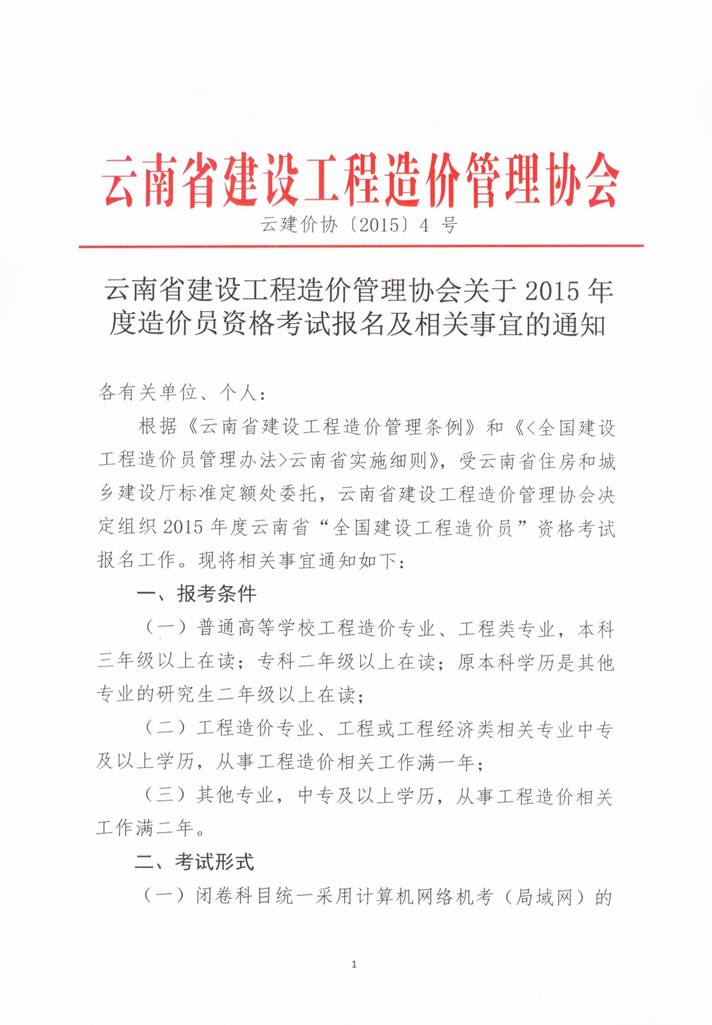 云南省2015年度造價(jià)員資格考試報(bào)名及相關(guān)事宜通知