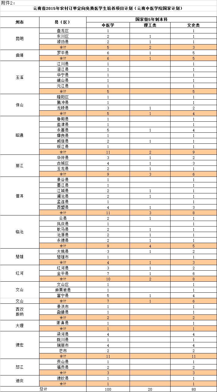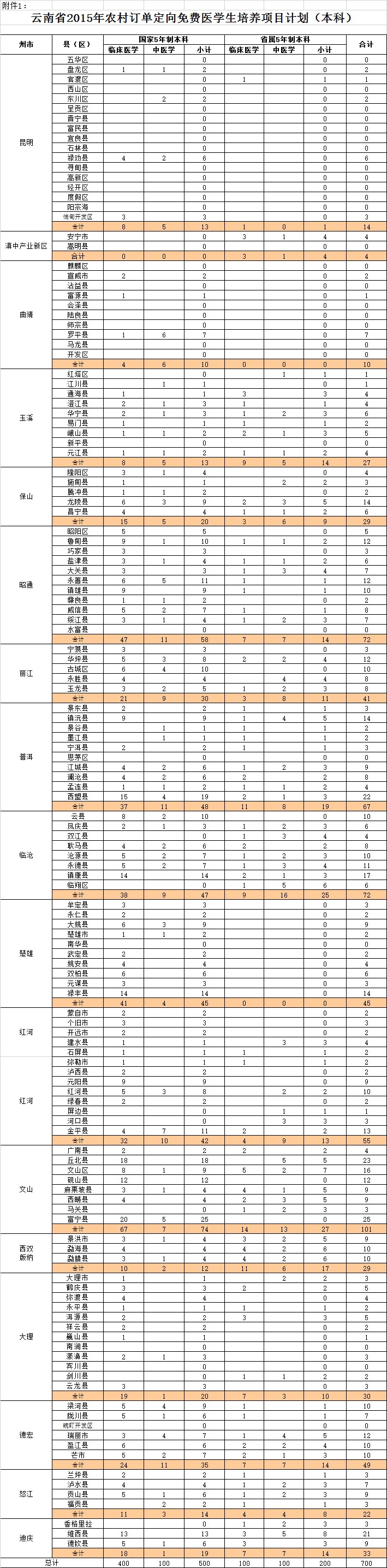 2.專科:5351曲靖醫(yī)學(xué)高等專科學(xué)校臨床醫(yī)學(xué)專科120人(理工類)、5352楚雄醫(yī)藥高等專科學(xué)校臨床醫(yī)學(xué)專科100人(理工類)、5353保山中醫(yī)藥專科學(xué)校中醫(yī)學(xué)專科160人(文史類)、5392德宏職業(yè)學(xué)院臨床醫(yī)學(xué)專科60人(理工類)、5398紅河衛(wèi)生職業(yè)學(xué)院臨床醫(yī)學(xué)專業(yè)60人(理工類)。分縣定向計劃見《云南省2015年農(nóng)村訂單定向免費醫(yī)學(xué)生培養(yǎng)項目計劃(專科)》(附件4)。