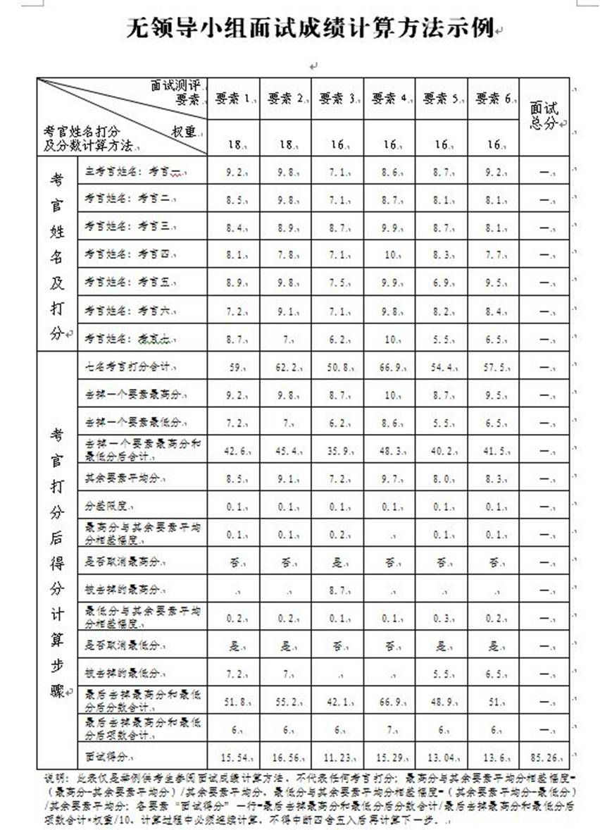 4.計分核分。當(dāng)天上午或下午的每一輪面試的考生面試結(jié)束后,計分人員收回考官打分的《無領(lǐng)導(dǎo)小組面試打分表》錄入計算面試考生的面試成績(具體方法詳見《無領(lǐng)導(dǎo)小組面試成績計算方法示例》),并將考生成績填寫到《無領(lǐng)導(dǎo)小組面試成績報告單》中(一式二份),主考官、計分人員、紀(jì)檢監(jiān)察監(jiān)督人員、人大監(jiān)督人員、政協(xié)監(jiān)督人員簽字后成績生效。