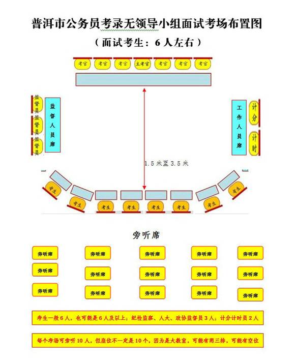 2.面試考場內(nèi)設(shè)主考官席、考官席、計分席、紀(jì)委監(jiān)察監(jiān)督席、人大監(jiān)督席、政協(xié)監(jiān)督席、考生席、旁聽席。