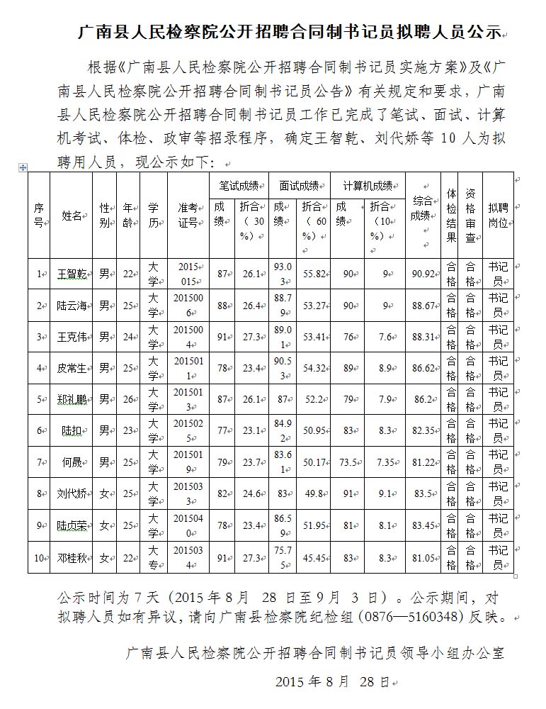 廣南縣人民檢察院2015年公開招聘合同制書記員擬聘人員公示