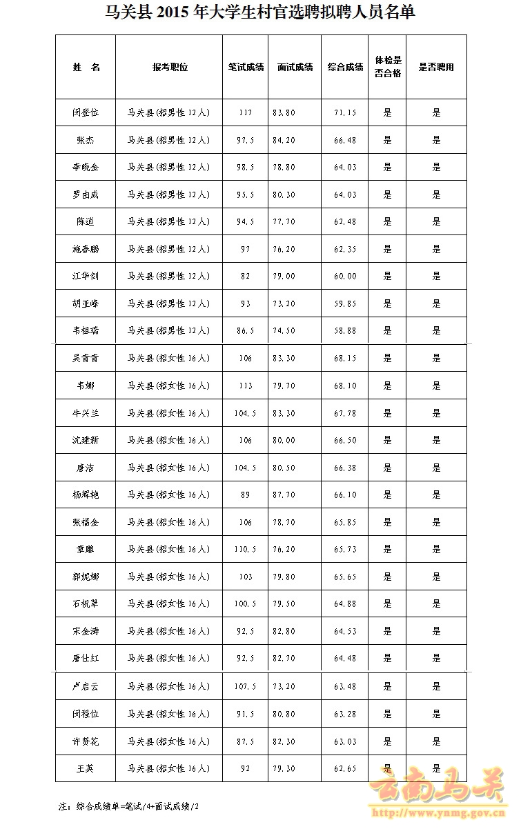 根據(jù)《云南省2015年大學(xué)生村官選聘公告》、省委組織部《關(guān)于做好2015年大學(xué)生村官選聘的工作的通知》(云組發(fā)電〔2015〕11號(hào))、《關(guān)于做好2015年大學(xué)生村官選聘面試工作的通知》及中共文山州委組織部《關(guān)于做好大學(xué)生村官選聘有關(guān)工作的通知》要求,馬關(guān)縣2015年選聘大學(xué)生村官資格復(fù)審、面試、體檢工作已經(jīng)結(jié)束。現(xiàn)將馬關(guān)縣2015年大學(xué)生村官擬聘人員予以公示(附表)。