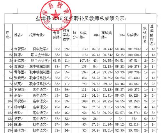 昭通市鹽津縣2015年招聘補(bǔ)員教師總成績(jī)公示