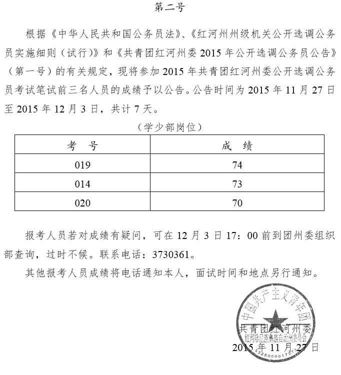 共青團(tuán)紅河州委2015年公開選調(diào)公務(wù)員筆試成績